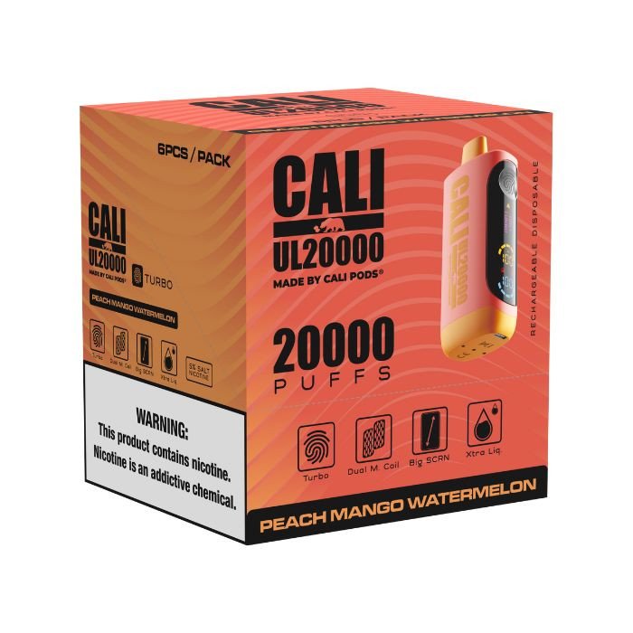 Peach Mango Watermelon delivers a vibrant cali vape experience blending juicy peach, sweet mango, and refreshing watermelon for a smooth tropical flavor in the Cali UL20000 Disposable.